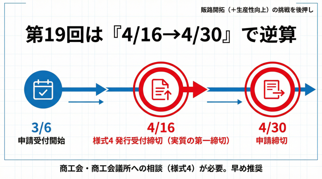 第19回は2026年4月30日が締め切りですが、実務的には2026年4月16日を締め切りと考えて動くのがベターではないでしょうか。なので、今から準備をすれば十分に間に合います。